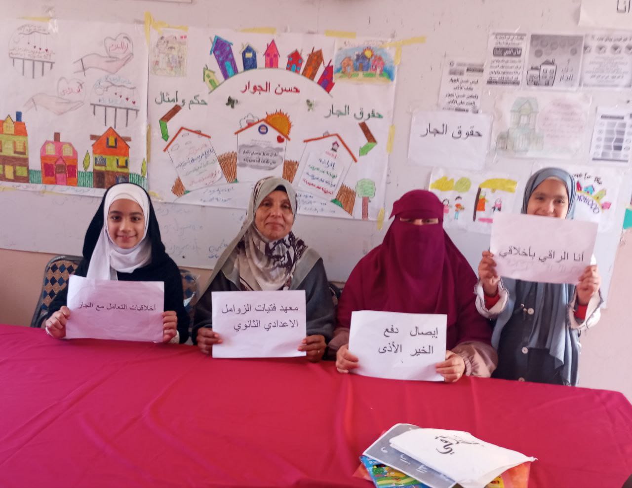 كما قام بعض الطلاب بتمثيل فقرات مسرحية تعكس معاني حسن الجوار ،وفي نفس الوقت قام الطلاب الموهوبين بتصميم مطويات وصحف حائط وبعض الرسومات التي تتناول قيمة إيصال الخير ودفع الأذى.