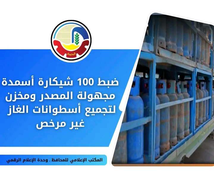 مخزن لتجميع أسطوانات الغاز التجارية غير مرخص بداخله ١٥ أسطوانة غاز كبيرة زنة ٢٥ كجم مملوءة بالغاز و ١٠٠ شيكارة أسمدة زراعية مجهولة المصدر داخل أحد مخازن بيع الأسمدة وتم التحفظ على المضبوطات وإتخاذ الإجراءات القانونية اللازمة حيال المخالفين،