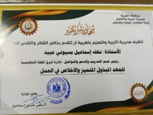 في إطار توجيهات السيد محمد عبد اللطيف، وزير التربية والتعليم والتعليم الفني، والسيد اللواء الدكتور علاء عبد المعطي، محافظ الغربية، وفي إطار تكريمه للمتميزين في العمل من جميع العاملين بالمديرية والإدارات التعليمية، قام اليوم الأستاذ ناصر حسن، وكيل وزارة التربية والتعليم بالغربية، بتكريم الأستاذة نهلة إسماعيل بسيوني، رئيس قسم التدريب والدعم والتواصل، بإدارة شرق المحلة التعليمية، وذلك للجهد المبذول المتميز، والإخلاص في العمل، وكيفية توظيف الذكاء الاصطناعي لخدمة العملية التعليمية.