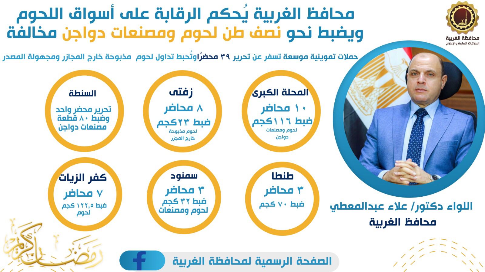 تنفيذًا لتوجيهات اللواء دكتور علاء عبد المعطي، محافظ الغربية، واصلَت مديرية التموين والتجارة الداخلية بالمحافظة تكثيف حملاتها الرقابية على الأسواق ومحال الجزارة خلال شهر رمضان المبارك، في إطار خطة متكاملة تستهدف إحكام الرقابة على تداول اللحوم والتأكد من سلامتها وصلاحيتها للاستهلاك الآدمي، والتصدي لظاهرة الذبح خارج المجازر الحكومية، وذلك بالتنسيق مع مديرية الطب البيطري.